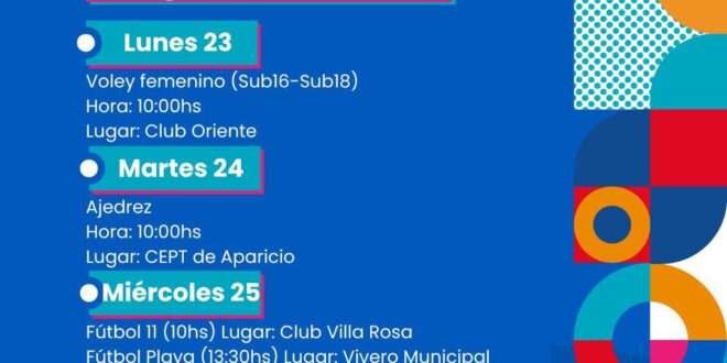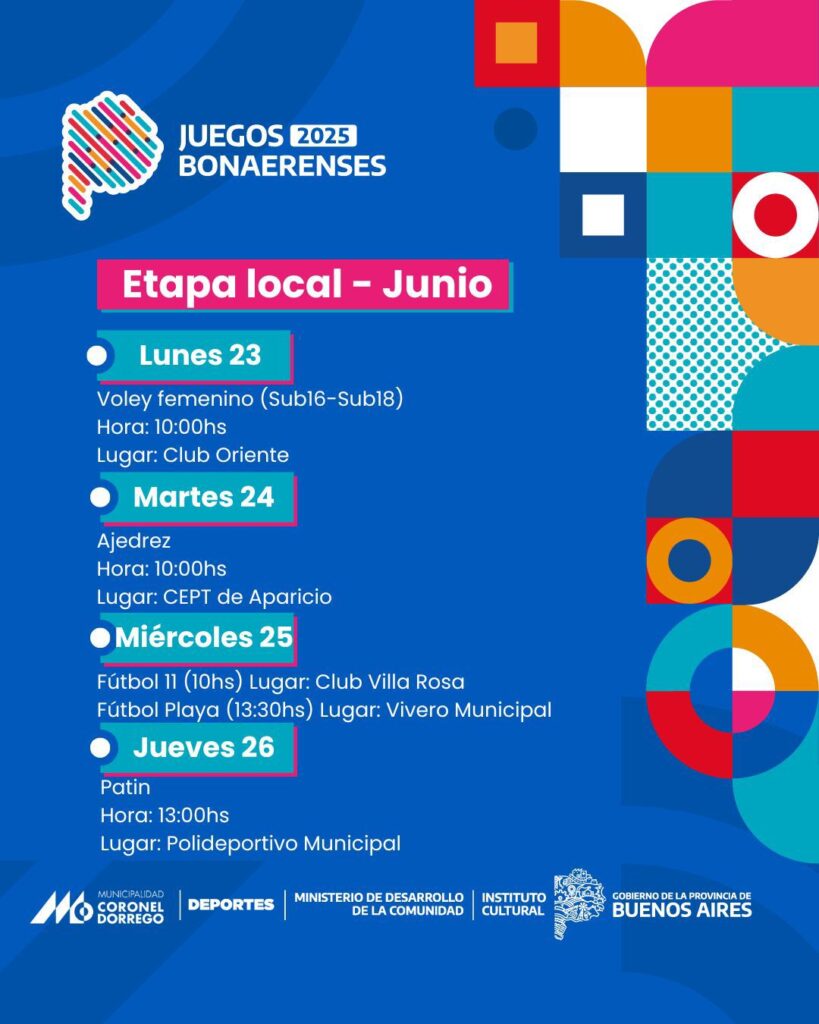 .Suspendida la etapa local de vóley en Oriente del día lunes 23 de Junio correspondiente a los Juegos Bonaerenses debido a la alerta meteorológica pronosticada.La misma se reprogramará en día y horario a confirmar.