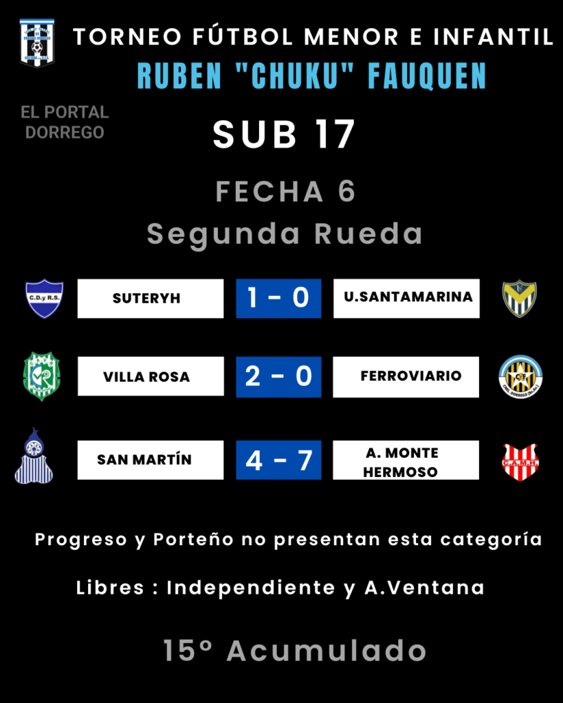| Independiente 15 Pts Suteryh 12 Pts A.M.Hermoso 6 Pts Villa Rosa 6 Pts Ferroviario 6 Pts. A.Ventana 4.Pts Porteño 4 Pts. San Martín 0 Pt. San Martín y A.M.Hermoso tienen un partido suspendido desde los 15′ del segundo tiempo en donde ganaba A.M.Hermoso 1 a 0 |