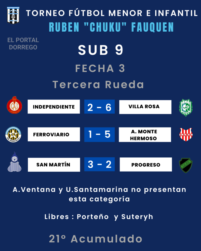 Villa Rosa vs Ferroviario A.Ventana vs Suteryh A.M.Hermoso vs San Martín Progreso vs Porteño Independiente vs U.Santamarina |