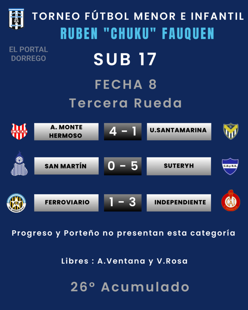 | Villa Rosa 18 Pts ( +13 ) Progreso 16 Pts ( + 16 ) A.Ventana. 16 Pts ( +7 ) Independiente 15 Pts A.M.Hermoso 13 Pts Suteryh 10 Pts U.Santamarina. 9 Pts Porteño 5 Pts Ferroviario 4 Pts San Martín 4 Pts U.Santamarina y Progreso tienen un partido postergado |