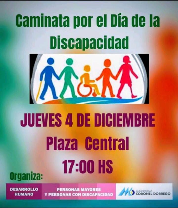 Desde la Dirección de Desarrollo Humano, a través del Área de Personas Mayores y Personas con Discapacidad, han invitado a la comunidad a realizar una caminata por el Día de la Discapacidad que se llevará a cabo mañana jueves 4 de diciembre a las 17 en la plaza Central.