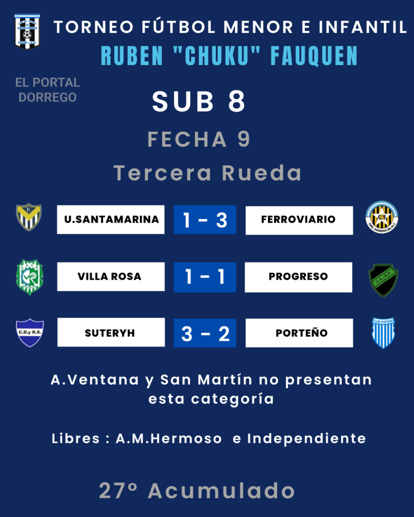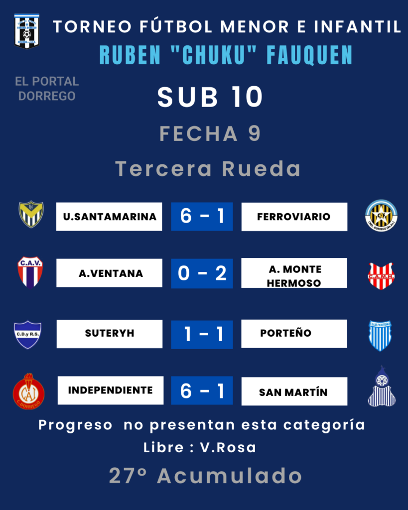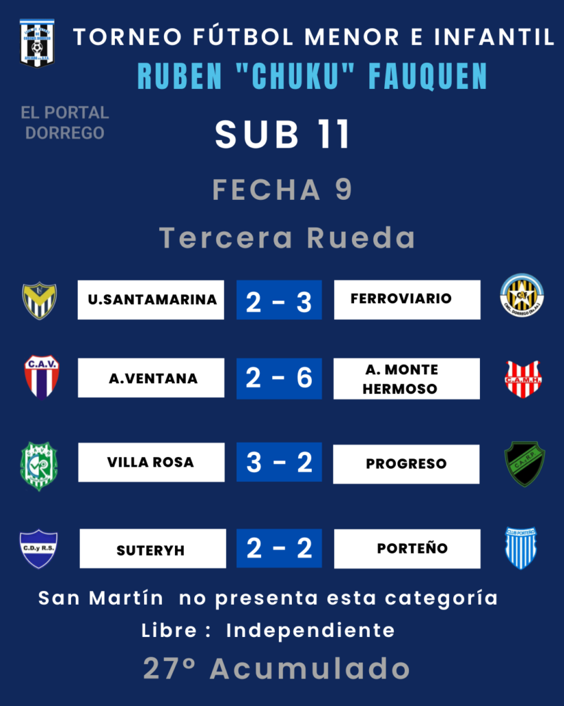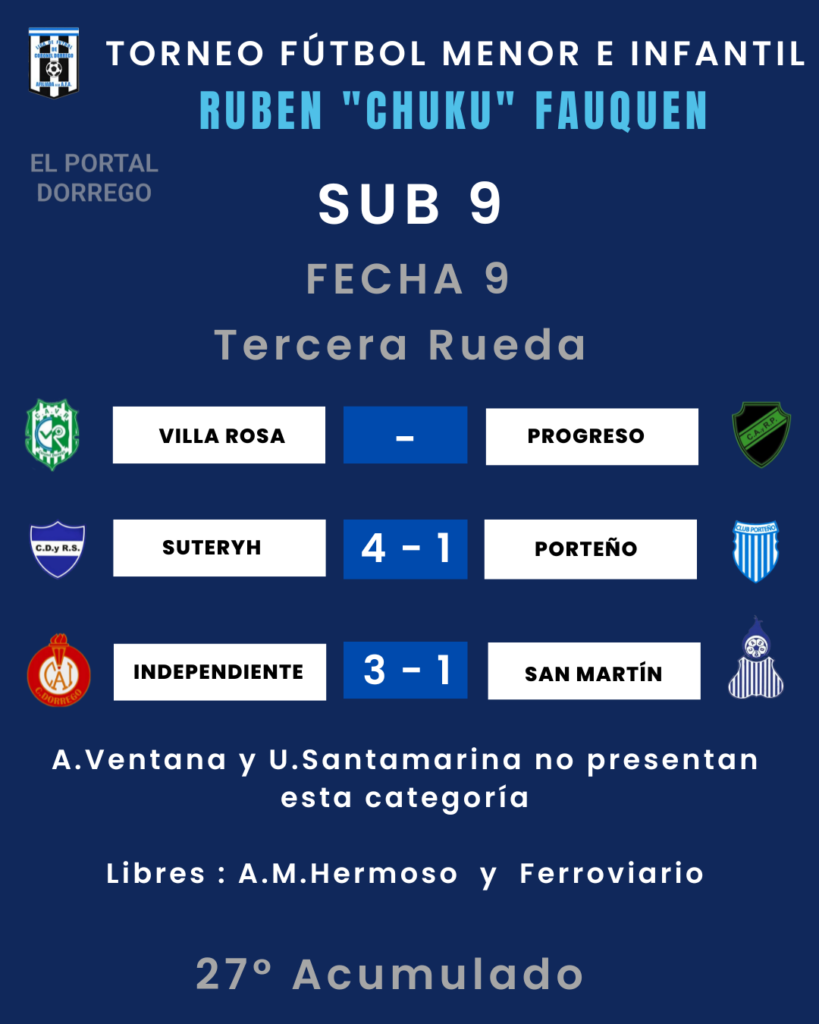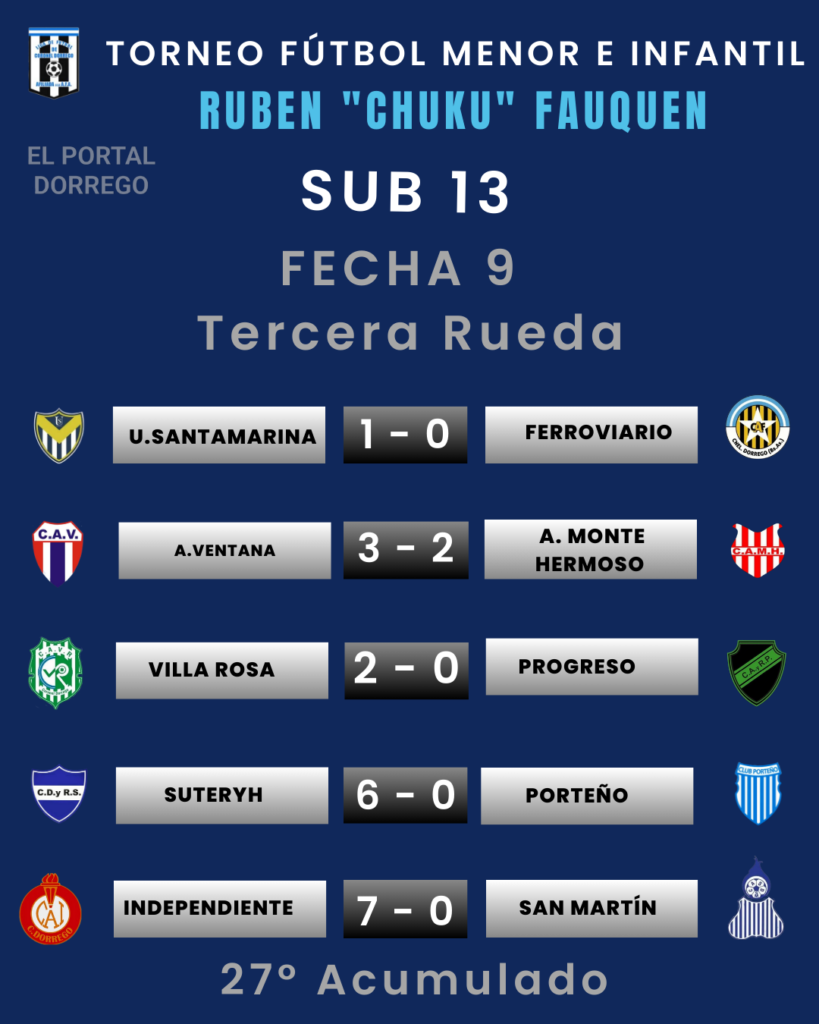 Se jugó la fecha 9 de la tercera rueda , 27 del Acumulado y última de la ronda clasificatoria del torneo de fútbol menor e infantil Ruben «Chuku’ Fauquen