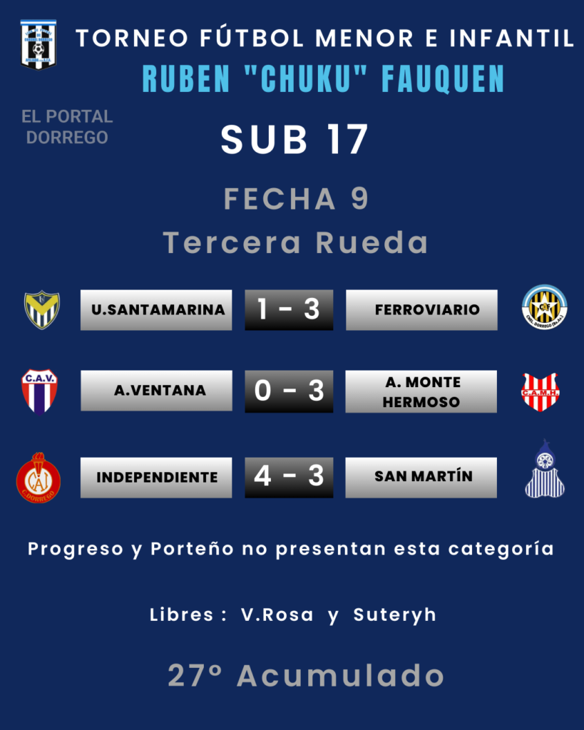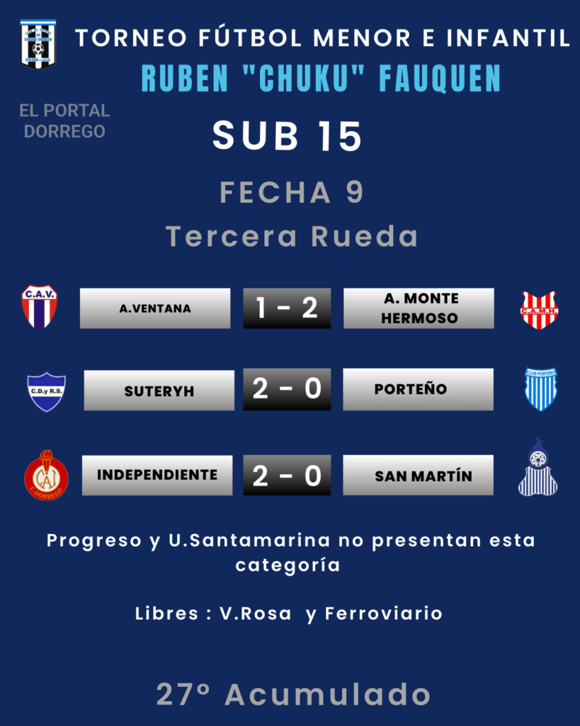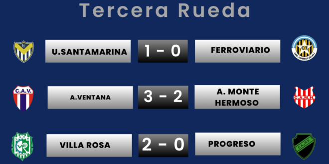 | Villa Rosa 21 Pts Progreso 19 Pts ( + 18 ) A.Ventana. 19 Pts ( +8 ) Independiente 18 Pts Suteryh 13 Pts ( +16 ) A.M.Hermoso 13 Pts ( -3 ) U.Santamarina. 12 Pts Porteño 5 Pts Ferroviario 4 Pts ( -15 ) San Martín 4 Pts ( – 26 ) Villa Rosa es el ganador de la tercera rueda |