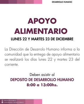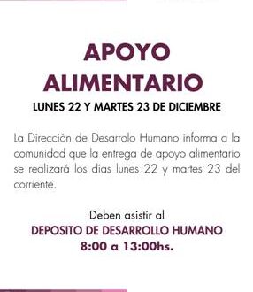 La Dirección de Desarrollo Humano de la comuna informó que se entregará Apoyo Alimentario, lunes 22 y martes 23. Hay que concurrir al depósito del área de 8 a 13.
