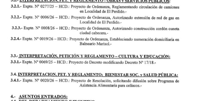 3.2.2.- Expte. Nº 0006/26 – HCD.: Proyecto de Ordenanza, Autorizando extensión de red de gas en Localidad de El Perdido.- APROBADO